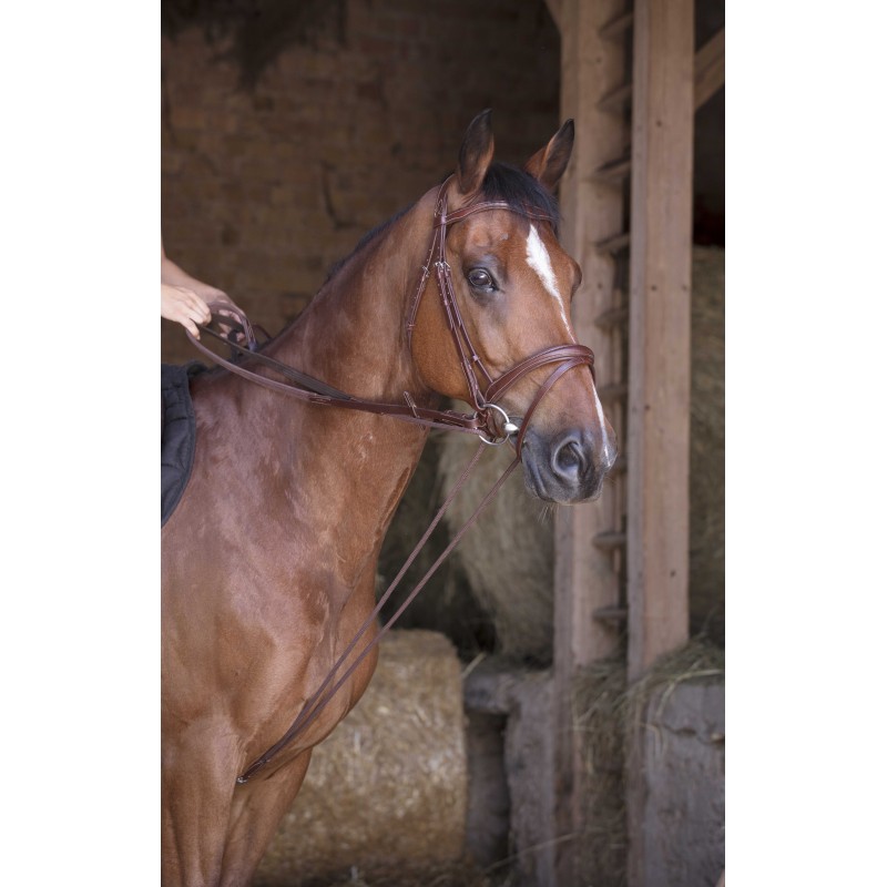 Петля одевается на подпругу, затем шнур продевается через трензельные кольца, идёт вдоль шеи лошади и застёгивается над холкой.