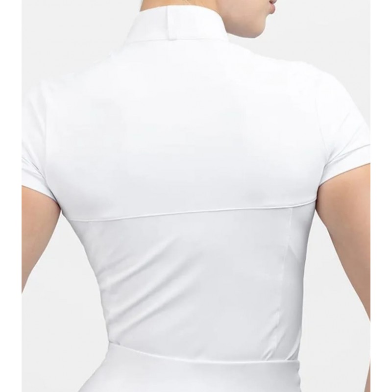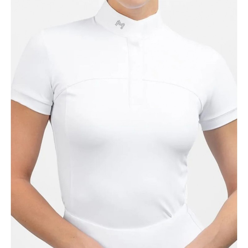 Турнирная блуза с коротким рукавом. Эластичная, мягкая ткань не сковывает движения всадника. Стойка со стразами,застегивается на кнопки для удобства. Кнопки спрятаны.