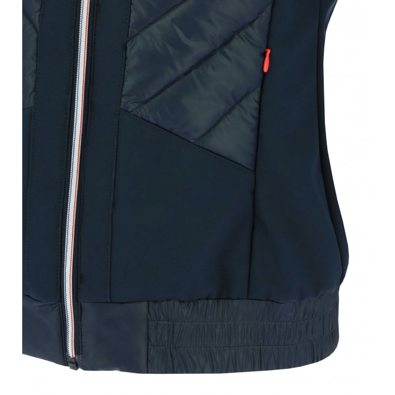изоляция : стеганая подкладка из полиэфирного волокна стрейч: контрастный материал из мягкой сетчатыособенности-эластичный низ куртки-застежка спереди на молнии-карманы для рук на молнии - эластичный наклон по краю капюшона и по низу рукава- приталенный кройо